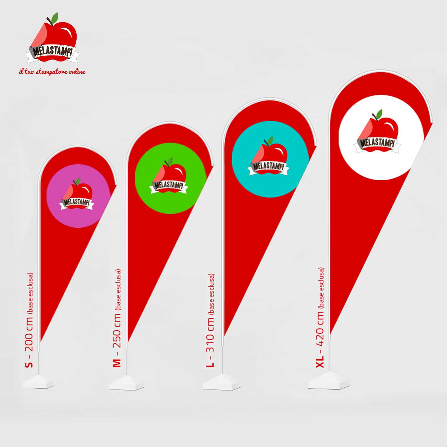 Le bandiere con supporto sono bandiere personalizzate da esterno, realizzate con stampa sublimatica digitale su tessuto, con altezze e basi diverse per tutte le esigenze. Ogni bandiera online proposta da Melastampi è un prodotto di qualità superiore a partire dal tessuto e dall’asta, realizzata in fibra di vetro, certificata CE e testata da SGS. Ogni bandiera è dotata di una comoda borsa porta struttura che facilita trasporto e montaggio. Tanti formati disponibili: potrai scegliere tra bandiere a goccia, ad ala, a piuma o rettangolari, con altezze e basi diverse per tutte le esigenze.